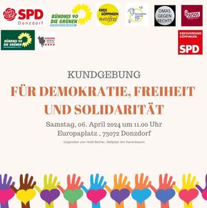 Rund 250 Teilnehmer fanden sich am Samstag, den 06. April auf dem Europaplatz in Donzdorf für eine friedliche Kundgebung zusammen, zu der die örtliche SPD mit Unterstützern aufgerufen hatte. So waren neben dem eigenen SPD-Kreisverband, der Grünen Orts- und Kreisverband, der Donzdorfer Jugendring, die Jusos-Göppingen, der Jugendbeirat Donzdorf, Omas gegen Rechts, Kreis Göppingen-nazifrei, die evangelische Kirche, der Sozialverband VdK Göppingen und unabhängige Bürger mittragend.